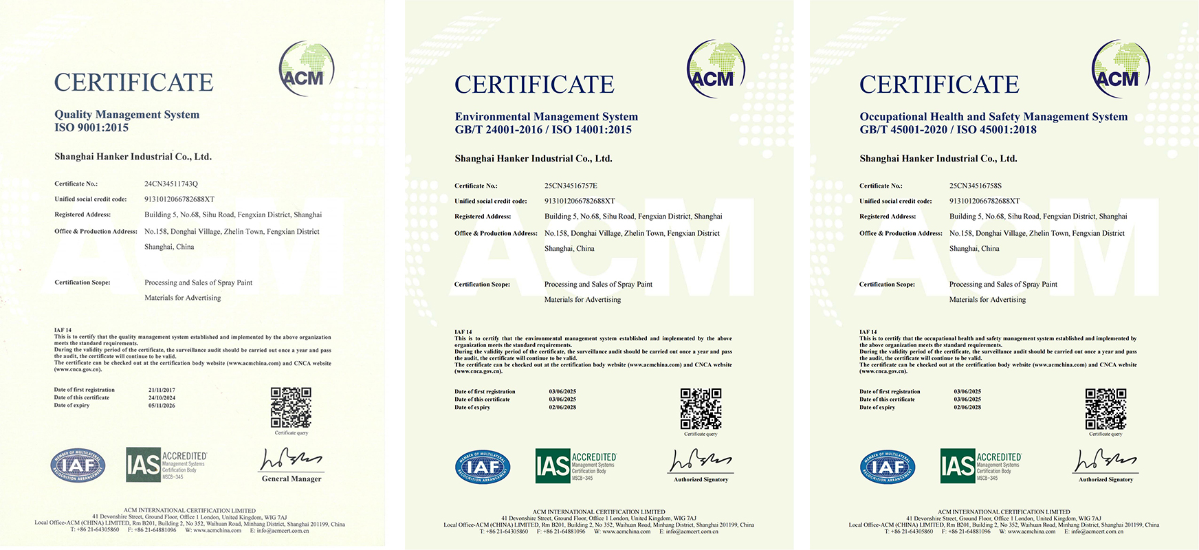 Nyligen erhöll Shanghai Hanker Industrial Co., Ltd. (kallad "Hanker") framgångsrikt ISO 9001: 2015 -certifiering av kvalitetshanteringssystem, ISO 14001 Miljöhanteringssystemcertifiering och ISO 45001 Arbetshälso- och säkerhetshanteringssystemcertifiering genom revisionen av ACM International Certification Limited. Denna prestation visar att företaget helt har uppfyllt internationella standarder för kvalitetskontroll, miljöskydd och anställdas säkerhet. Förvärvet av dessa tre systemcertifieringar är resultatet av Hankers långsiktiga engagemang för standardiserad ledning. Genom att optimera produktionsprocesser, etablera miljöriskförebyggande och kontrollmekanismer och förbättra utbildningssystemen för arbetshälsa och säkerhet har företaget uppnått standardiserad kontroll över hela kedjan från råmaterialupphandling till färdig produktleverans. I framtiden, med dessa certifieringar som en stiftelse, kommer Hanker att fördjupa teknisk innovation och uppgradering av hantering, aktivt främja bransch-universitetsforskningssamarbete med universitet, utforska banbrytande tillämpningar inom materialområdet och bidra till den högkvalitativa utvecklingen av branschen.